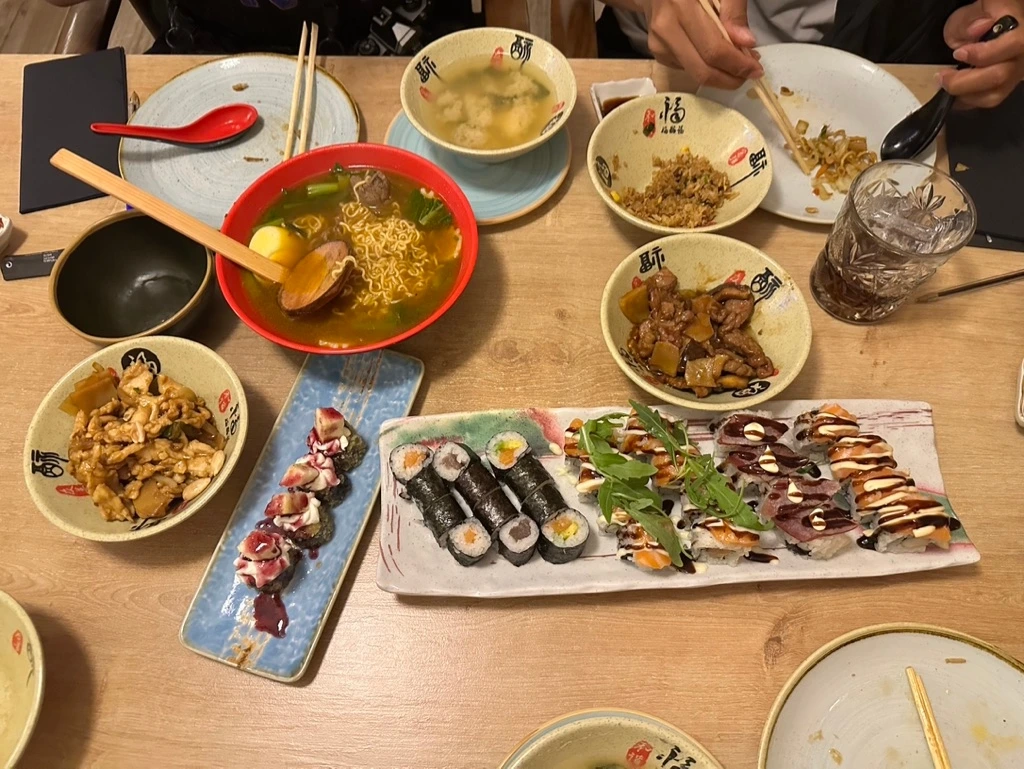 도시 구경을 하는 동안 준호와 태훈이 40km가까이 걸어 레온에 도착했다며 연락을 했다. 최후의 만찬(?) 이후로 넷이 뿔뿔이 흝어져 걷게 되었는데 준호와 태훈도 이틀 코스를 당겨서 하루만에 걸어 왔다고 했다. 성당 앞 포토존에서 서로서로 기념사진을 찍어주고 기념품 가게에서 배낭에 걸 가리비도 다시 구입했다. 둘 다 길게 걸어오느라 점심을 먹지 못했고 나도 식사 전이라 애매한 시간이지만 밥을 먹기로 했다. 평이 그럭저럭 하던 뷔페를 가보고 싶다고 하니 나머지 둘도 좋다고 했다. 중국인이 사장님이 운영하는(것으로 추정되는) 중식과 초밥이 섞인 아시아풍 뷔페라고나 할까. 뷔페 가격이 빨간색 검은색으로 표기 되어있는데 모든 메뉴를 다 먹을 수 있는 빨간색은 23.95유로, 일부 메뉴인 검은색은 17.95유로였다. 메뉴판을 둘러보니 검정으로도 충분해서 검정을 선택. 여기에 조건이 하나 더 있었는데 음식을 남기면 2유를 내야 했다. 접시에 음식을 담아 오는 게 아니라 김밥천국 주문처럼 종이에 적인 메뉴에 개수를 표기해서 건네주면 요리를 서빙해 주는 시스템이었다.