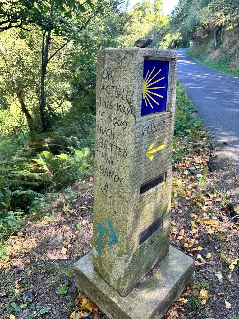늦은 출발에 마을이 한산하다. 늦은 김에 건너편 바에서 다 함께 아침을 먹기로 했다. 아무리 생각해도 마틴의 작명이 너무 탁월했다. 우린 정말 Always Late.. 오늘은 출발지부터 두 갈래 길로 나뉜다. 더 짧지만 오르막이 있는 산실 길과 7km 더 길지만 풍경이 좋고 수도원을 거쳐가는 사모스길. 나와 제임스, 앰버는 산실을 택하고 마틴과 이안, 도영은 사모스 길을 택했다. 양쪽 방향이 새겨진 두 개의 비석이 나란히 놓인 곳에서 두 그룹이 손을 흔들며 헤어졌다.