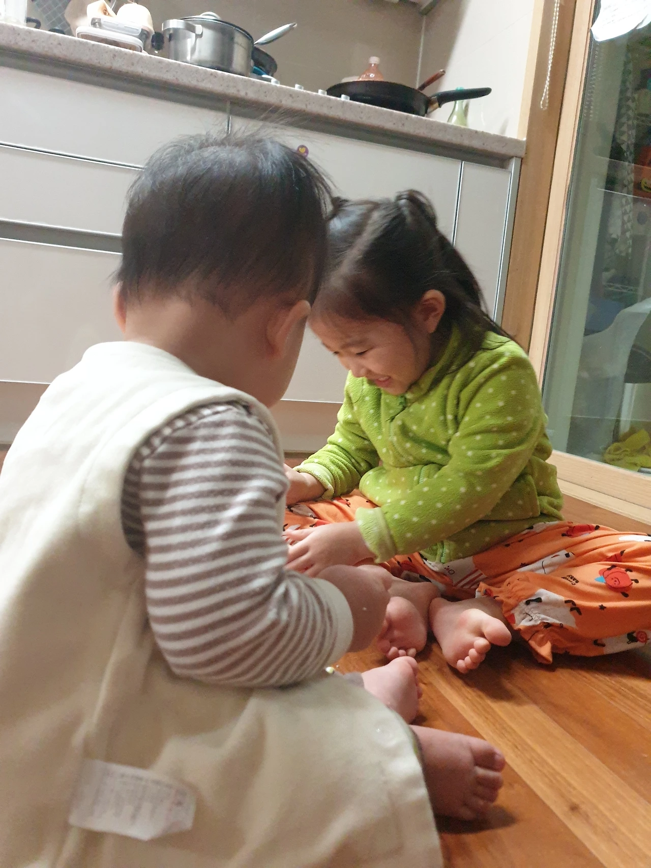 첫째가 둘째에게 이유식 먹여주는 모습. 둘다 초상권을 묻지 않았기에 잘 안나온 사진을 올리다보니 밥 먹이는 게 안 보이기는 하다.