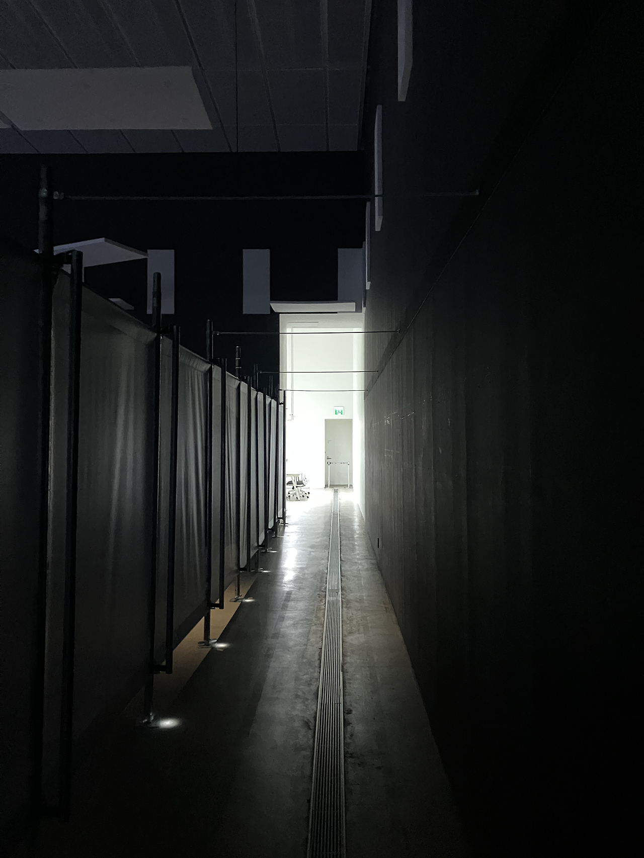 이런 동선 구조는 <워치앤칠>의 전시 특성에 부합한다고 생각한다. 일반적으로 우리가 영화나 영상작업을 감상할 때 되감기는 불가능하다. 집에서 개인적으로 감상하는 영상이 아닌 이상 영상물은 계속해서 흘러가며 같은 장면을 다시 보기 위해서는 영상을 처음부터 다시 감상해야 한다. 이는 <워치앤칠>에서도 똑같이 적용된다. 물론 관람객의 의지에 따라 스스로의 동선을 뒤감기할 수 있다. 그러나 출구방향에 표시된 비상구등과 초록 조명은 사람들로 하여금 재생방향에 따라 움직이게끔 유도한다.