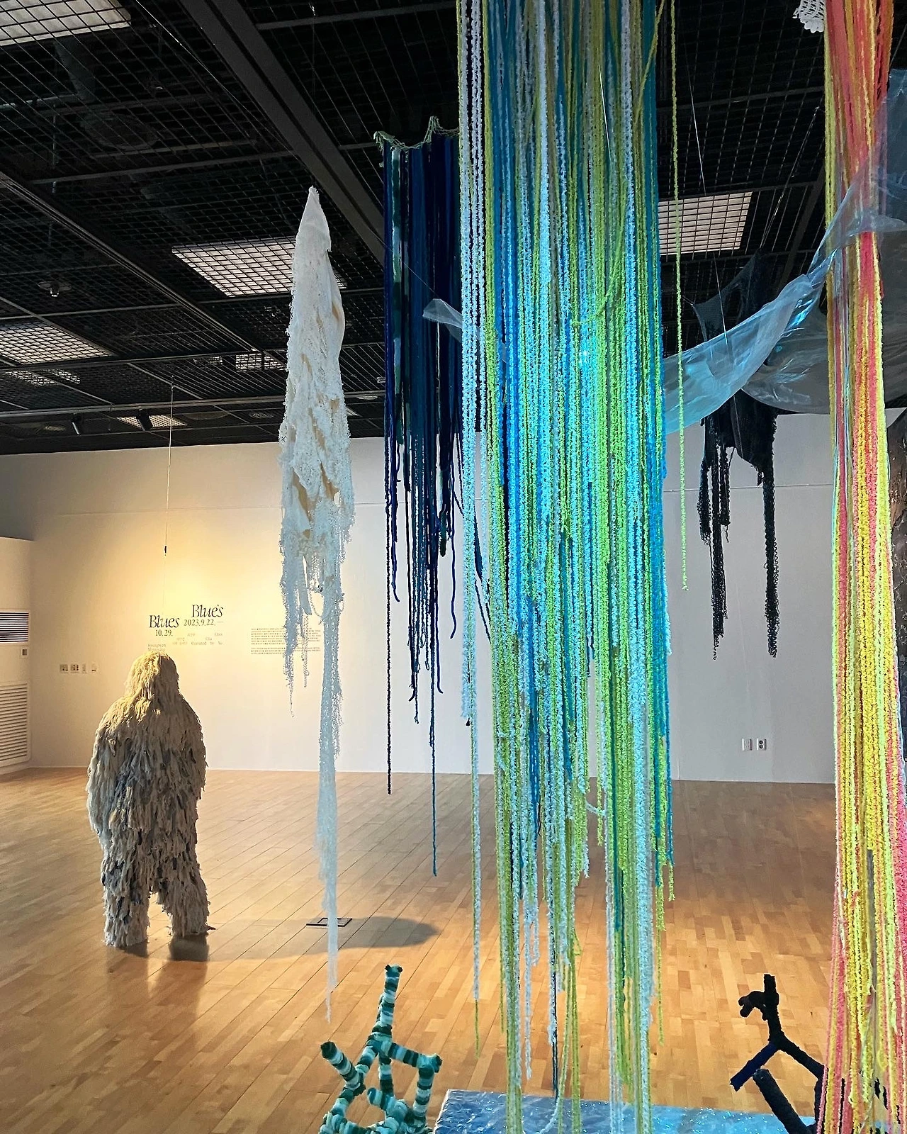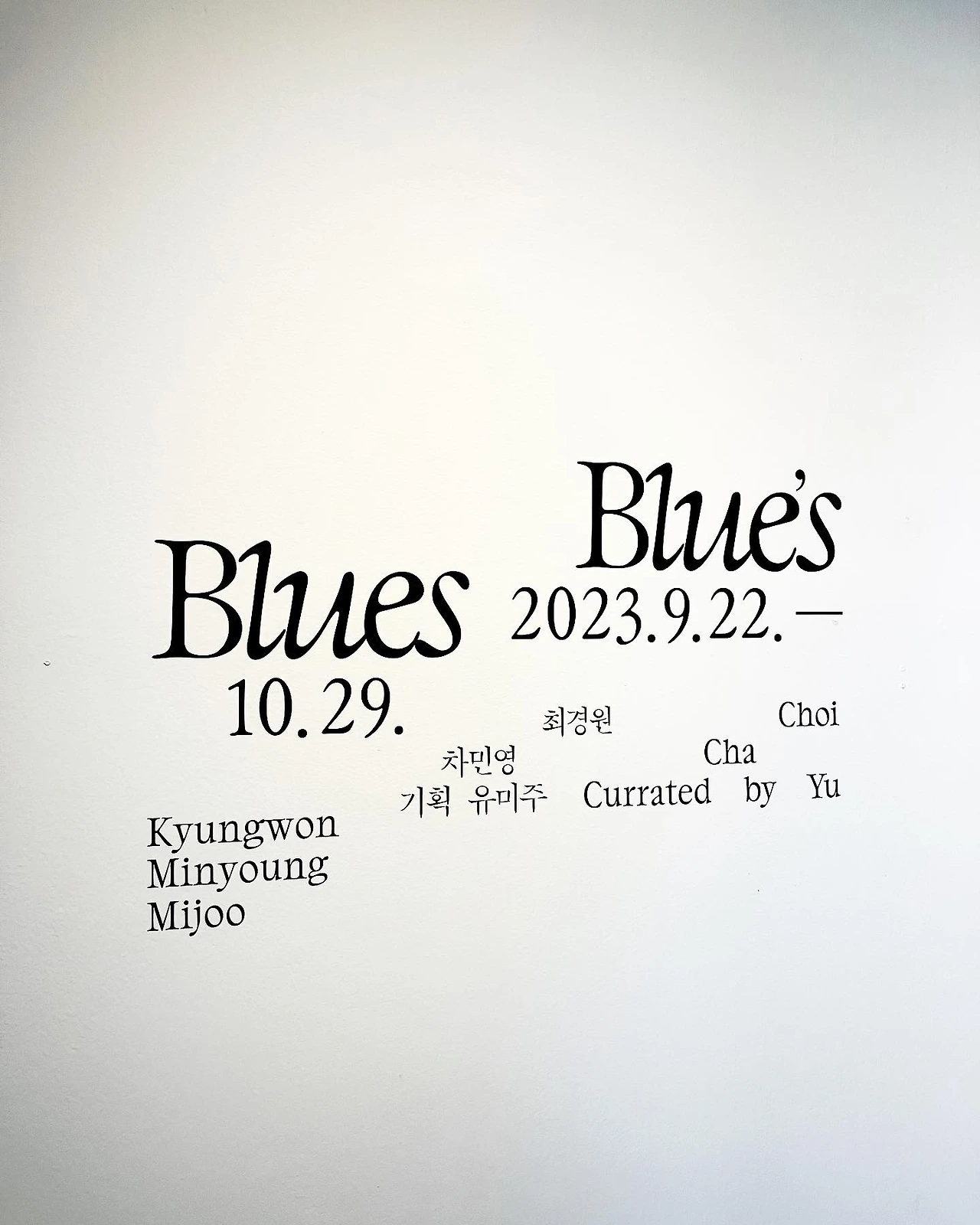그러나 이번에 관람한 인천에 위치한 부평 아트센터에서 진행되는 전시 <Blue‘s Blues>는 이런 문자로부터의 속박을 벗어던졌다. 전시장에서 우리에게 제공되는 문자는 매우 짧고 간결하다. 기존 전시들에서 드러나는 글자의 홍수는 여기에 없었다.