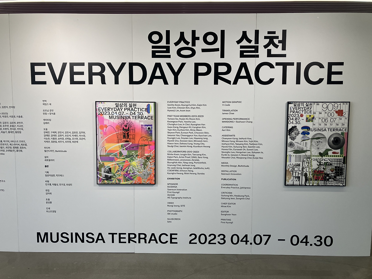 이번 무신사 테라스에서 열리는 <일상의 실천>은 전시, 행사의 얼굴을 모아놓았다. 권준호, 김경철, 김어진이 운영하는 그래픽디자인 스튜디오 일상의 실천이 제작한 디자인 작품을 모아놓은 이번 전시는 한 디자인 회사가 어떤 스타일의 포스터를 만드는지와 함께, 그 포스터가 전시를 어떤 얼굴로 소개하고자 하는지를 보여준다.