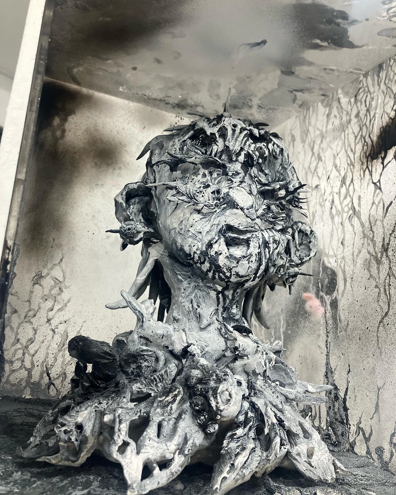 미소녀와 악마신앙적인 요소가 섞인 이미지 외에도 직접적으로 공포적 이미지를 드러내는 작품 역시 공간의 분위기를 구성하는데 큰 역할을 수행한다. 호러 만화의 대가 이토 준지의 그림이 연생되는 평면작업과 함께 형체를 알 수 없는 인물의 흉상이 대표적이다. 특히 흉상이 매우 인상깊었다. 전시 공간에 위치한 머리를 조각한 작품임에도 불구하고 ‘조각’ 보다도 ‘제물’에 가까운 분위기를 만들어내는 작품이었다. 이는 전시장 전반에서 풍기는 호러의 분위기가 만들어낸 이미지로 보인다.