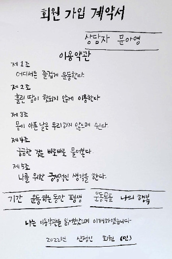 선생님이 알바에서부터 정직원이 되기까지 파릇파릇한 신입 FC의 일상을 직접 들어보게 되었다. FC란 피트니스 컨설턴트(Fitness Consultant)로 말 그대로 센터의 상담 업무를 주로 한다. 선생님이 알려주는 FC가 하는 일에서는 상담이 전부는 아니었다. 회원관리, 시설관리, 광고, 홍보, 마케팅, 매출업무 등 센터 경영을 한다고 보면 된다. 선생님은 마인드휘트니스에 알바로 먼저 시작을 했다. 승무원을 준비하고 있어서 서비스 경험이 필요할 것 같아 서비스 관련 알바를 찾다보니 FC일을 처음 시작하게 되었다. 동네 헬스장정도로 생각했던 선생님은 마인드 휘트니스의 규모에 깜짝 놀랐다고 한다. 이미 선생님이 지원한 인제점은 10호점이었고, 부서와 직급이 나누어져 있으며 체계적인 회사에 오히려 승무원 지원할 때 경력 인정이 될 거 같아 좋았다고 한다. 선생님이 주로 하는 일은 시설관리, 청소와 센터 정비 등 새벽 동안 문제가 없었는지 특히 비나 태풍이 왔을 때 비새는 곳이 없는지 확인하여 회원들의 불편함이 없도록 문제 해결을 하는데 신경을 썼다. 오전에 오는 회원들은 대부분 정해져 있어 얼굴을 익히고 새로 상담 온 회원들에게 시설 안내 및 세일즈, 회원권과 PT 상담, 전화로 오는 가격 문의, GX(Group Exercise)예약도 그녀의 몫이었다. 센터의 일이 적응될 쯤 선생님에게 정직원으로 전환할 수 있는 기회가 생겼다. 잠시 경력만 쌓으려고 온 곳인데 정직원을 택한 이유로는 코로나로 항공업계 취업이 어려워졌고, 같이 일하는 직원 분들이 좋아서 계속 일을 하고 싶었다. 그리고 그간 정이 들어버린 회원분들이 있어 소통하는 재미와 친해졌기에 이런 관계를 끊기에 마음이 약한 선생님은 좀 더 일을 하기로 했다. 일하면서 가장 힘든 점은 매출이었다. 세일즈를 해야 하는데 회원들을 만나서 하는 것은 어렵지 않지만 계속 할 생각이 없는 사람에게 유도하는 것은 부담스러우면서도 어려웠다. 물론 컴플레인이 들어오는 것을 대처하는 것도 힘들었다. 보통 컴플레인 들어온 내용은 PT선생님이 배정되지 않아 회원 분들이 선생님의 연락을 기다리다 지쳐 컴플레인이 오면 잘 이야기 해줘야 한다. 특히나 인제점에 있으면서 제일 많이 얘기를 듣는 문제가 ‘주차’였다. 마인드 휘트니스 인제점은 주차 공간이 넓지 않아 회원분들이 주차장이 좁다는 말은 물론 당연하다는 듯 발렛파킹을 맡기는 경우도 대다수라 한다. 선생님도 사람인지라 속상하고 화날 때도 있지만 어찌되었건 이곳은 직장이기에 참고 감수해나갈 수밖에 없었다.