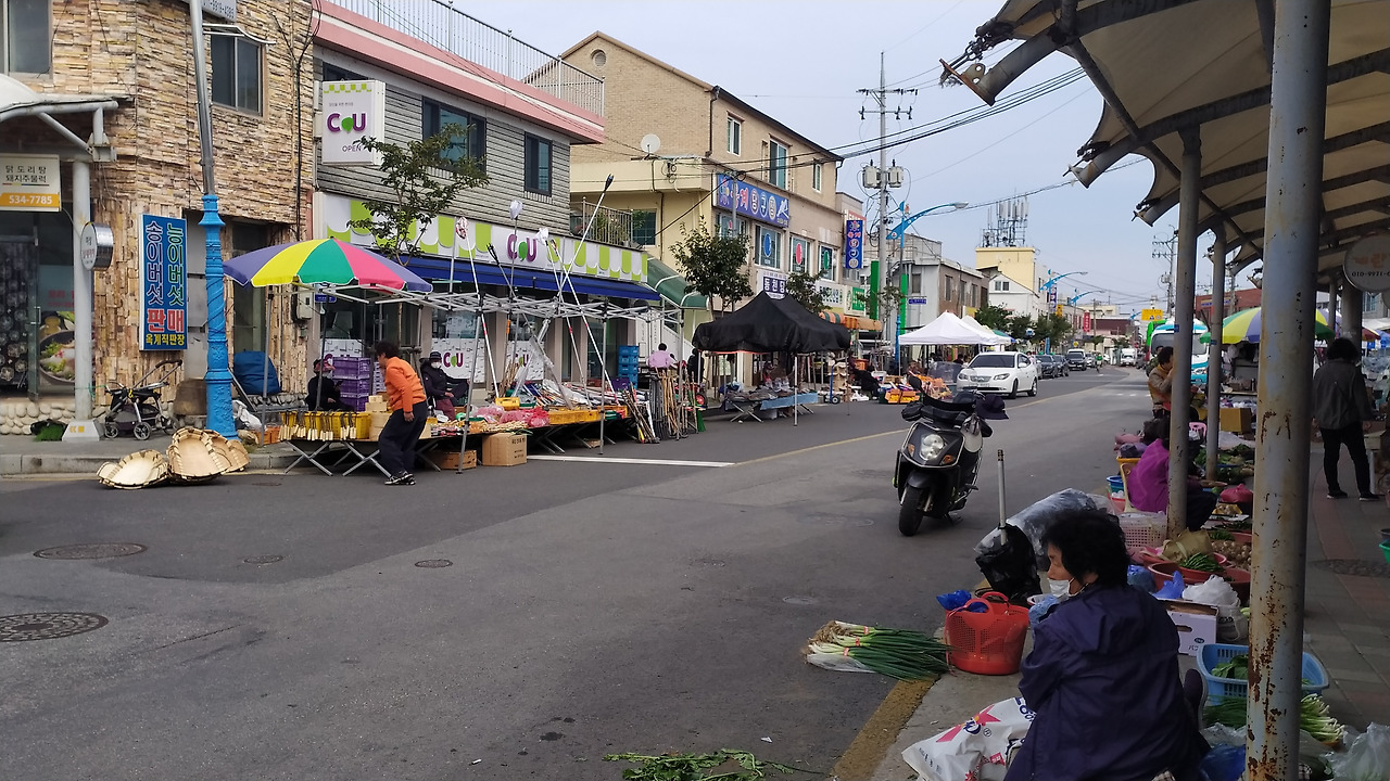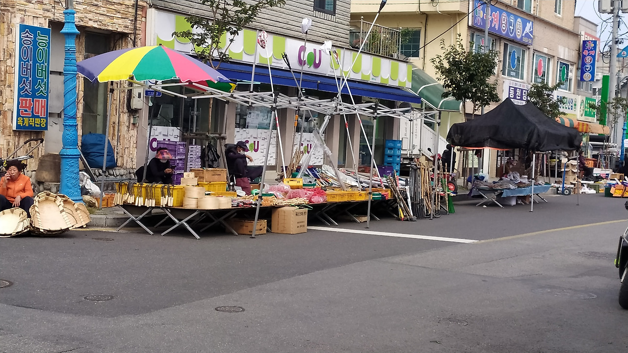옥계시장은 하나로 마트, 약국, 한의원, 피씨방, 식당, 치킨집 등 웬만한 상점들을 대부분 갖추고 있는 면사무소 옆 시장입니다. 시골 마을인데도 식당이 많은 것은 인근에 옥계산업단지가 있기 때문일 것입니다. 장날을 맞아 과일, 나물과 채소, 농기구 및 각종 생활용품 등 난전이 펼쳐지고 차량과 사람들로 활기를 띠고 있었습니다