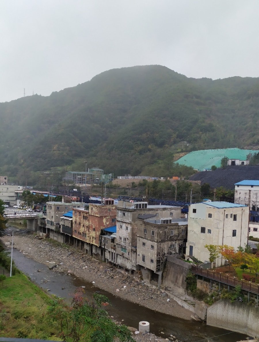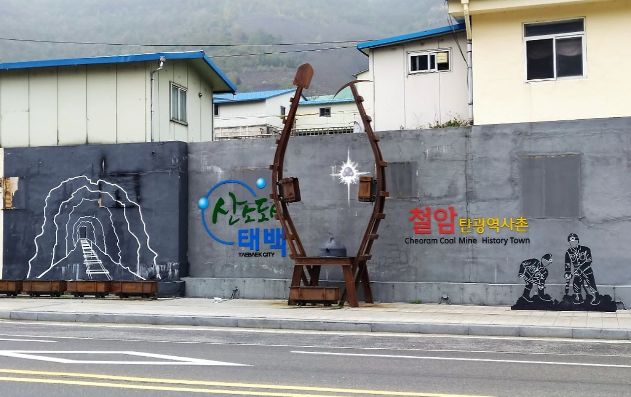 "마을이 보이는데 관광지인 것 같다. 내려서 잠깐 구경하고 가도 되겠지?" 남편의 말에 바깥을 보니 두엇씩 돌아다니는 사람들의 모습이 눈에 띄었습니다. 주차장에 차를 세우고 내려서 살펴보니 철암 탄광 역사촌입니다. 가랑비가 내리는지라 우산을 펴 들고 주변을 살펴보니 사라져 가는 탄광 마을 옛 모습을 일부 보존하여 역사사료 삼아 관광지로 꾸며놓았습니다. 4층짜리 낡은 상가건물 내부는 코로나로 인해 임시휴관이어서 관람을 못해 아쉬웠습니다. 시간이 넉넉지 않아 마을 전체를 자세히 살펴보지 못하고 전망대와 마을 공원만 둘러보고 철암역에서 감자떡을 산 후, 서둘러 길을 떠났습니다.