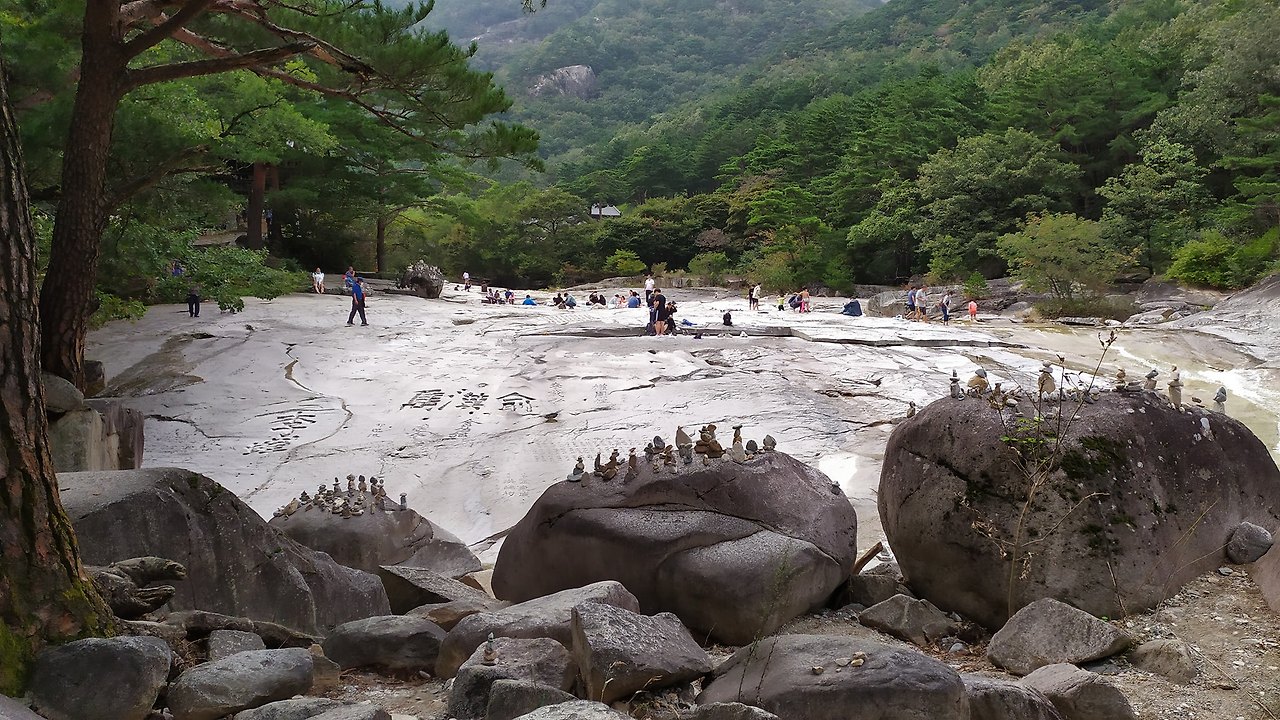주차장에 차량이 많은 걸 보니 관광객 상당수가 무릉계곡을 찾은 것 같았습니다. 입구에서 표를 끊은 뒤, 열 체크하고 입장하니 관람객 행렬이 줄줄이 이어집니다 20분 정도 걸으니 널찍한 반석을 낀 계곡이 나오고 주변 바위에 앉아 선선한 바람맞으며 자연을 벗하는 사람들이 눈에 들어옵니다. 절경이 따로 없습니다. 발을 담그지는 않았지만 맑은 계곡물소리를 들으니 마음이 씻기는 듯 청량하고 탁 트인 전망에 눈 앞이 시원해집니다.