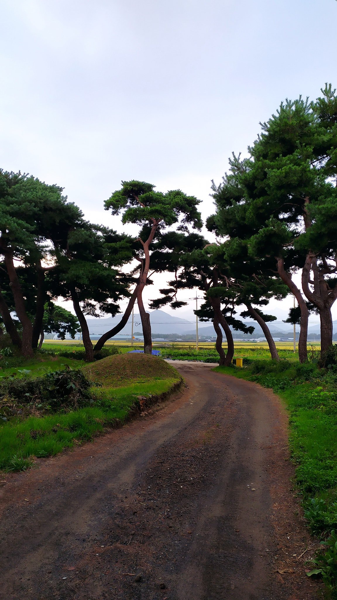 솔숲 사이 오솔길로 접어들었습니다. 사람들의 발길이 뜸한 탓인지 흙길에는 온갖 잡풀들이 무성합니다. 그리고 소나무 아래에는 묘소가 간간이 보입니다. 오솔길을 지나 포장된 도로로 이동하여 금진초등학교 쪽으로 걷다 보니 양쪽 소나무 그늘 아래 무덤들이 무리 지어 있는 것이 눈에 띕니다.