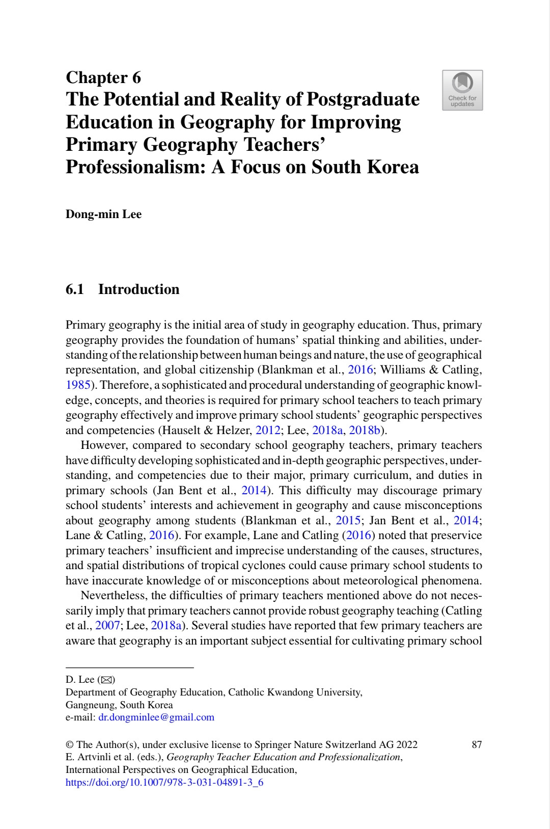 서지정보: Lee, Dm. (2022). The Potential and Reality of Postgraduate Education in Geography for Improving Primary Geography Teachers’ Professionalism: A Focus on South Korea. In: Artvinli, E., Gryl, I., Lee, J., Mitchell, J.T. (eds) Geography Teacher Education and Professionalization. International Perspectives on Geographical Education. Springer, Cham. https://doi.org/10.1007/978-3-031-04891-3_6