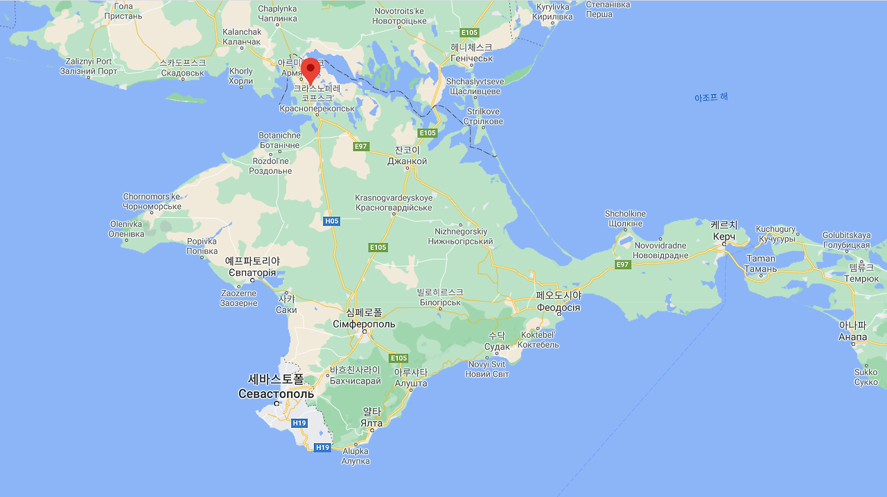페레코프 지협(지도상에 표기된 부분)은 폭 약 8km에 불과하며, 이외에는 크림 반도와 우크라이나 본토의 연결부가 없다. 연륙교는 2차대전 이후에 건설되었다.(구글지도)