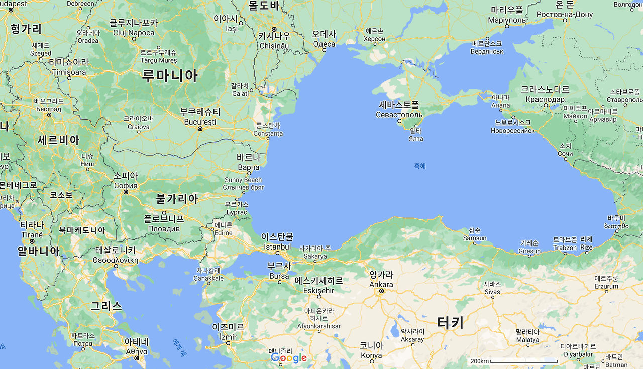 크림반도 남서부의 항구도시이자 군항도시인 세바스토폴은, 흑해 해상권의 요지이다.(구글 지도)