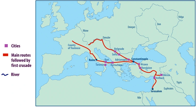 제1차 십자군 전쟁은 1097년에 비로소 일어났다. 유럽 전역에서 수만 명에 달하는 영주와 기사들이 자발적으로 갑주를 입고 무기를 든 채 동방으로 향했다. 그중에는 영지와 재산을 상속받지 못한 가난한 기사들도 있지만, 많은 영지와 강력한 권력을 가진 명문 대귀족들도 상당수 포함되어 있었다. 오늘날의 군대와 달리 개별적으로 목적지에 집결한 뒤 전장으로 향했던 중세 십자군 기사들은 1097년 콘스탄티노플에 집결을 완료했다. 도나우강에서 판노니아 일대를 거쳐 집결한 기사들도 있었지만, 상당수의 기사들은 이탈리아반도에서 해로를 따라 콘스탄티노플로 이동했다.