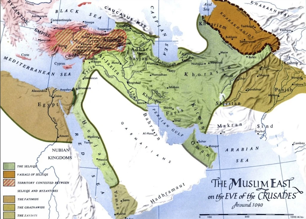 11세기 후반에 이르러 이슬람 세계는 튀르크족의 대두와 더불어 오랫동안 로마의 지배를 받아오던 아나톨리아반도를 대부분 정복하는 등 겉으로는 세력을 확장하는 듯했지만, 내부적으로는 분열되어 있었다. 이슬람 세력 스케일의 지정학적 상황은 거대한 외부 세력의 침공에 대처하기에는 불리한 방향으로 조성되고 있었다.