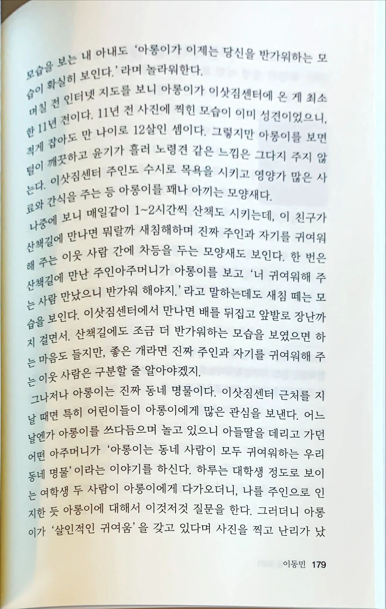 그나저나 아롱이는 진짜 동네 명물이다. 이삿짐센터 근처를 지날 때면 특히 어린이들이 아롱이에게 많은 관심을 보낸다. 어느 날엔가 아롱이를 쓰다듬으며 놀고 있으니 아들딸을 데리고 가던 어떤 아주머니가 ‘아롱이는 동네 사람이 모두 귀여워하는 우리 동네 명물’이라는 이야기를 하신다. 하루는 대학생 정도로 보이는 여학생 두 사람이 아롱이에게 다가오더니, 나를 주인으로 인지한 듯 아롱이에 대해서 이것저것 질문을 한다. 그러더니 아롱이가 ‘살인적인 귀여움’을 갖고 있다며 사진을 찍고 난리가 났다. 이삿짐센터에 오랫동안 묶여 있는 일은 분명 편안하지 않겠지만, 주인의 정성 어린 보살핌에 더해 동네 사람들의 사랑까지 듬뿍 받는 ‘동네 개’의 삶은 분명 괜찮다고 봐야 할 듯싶다.