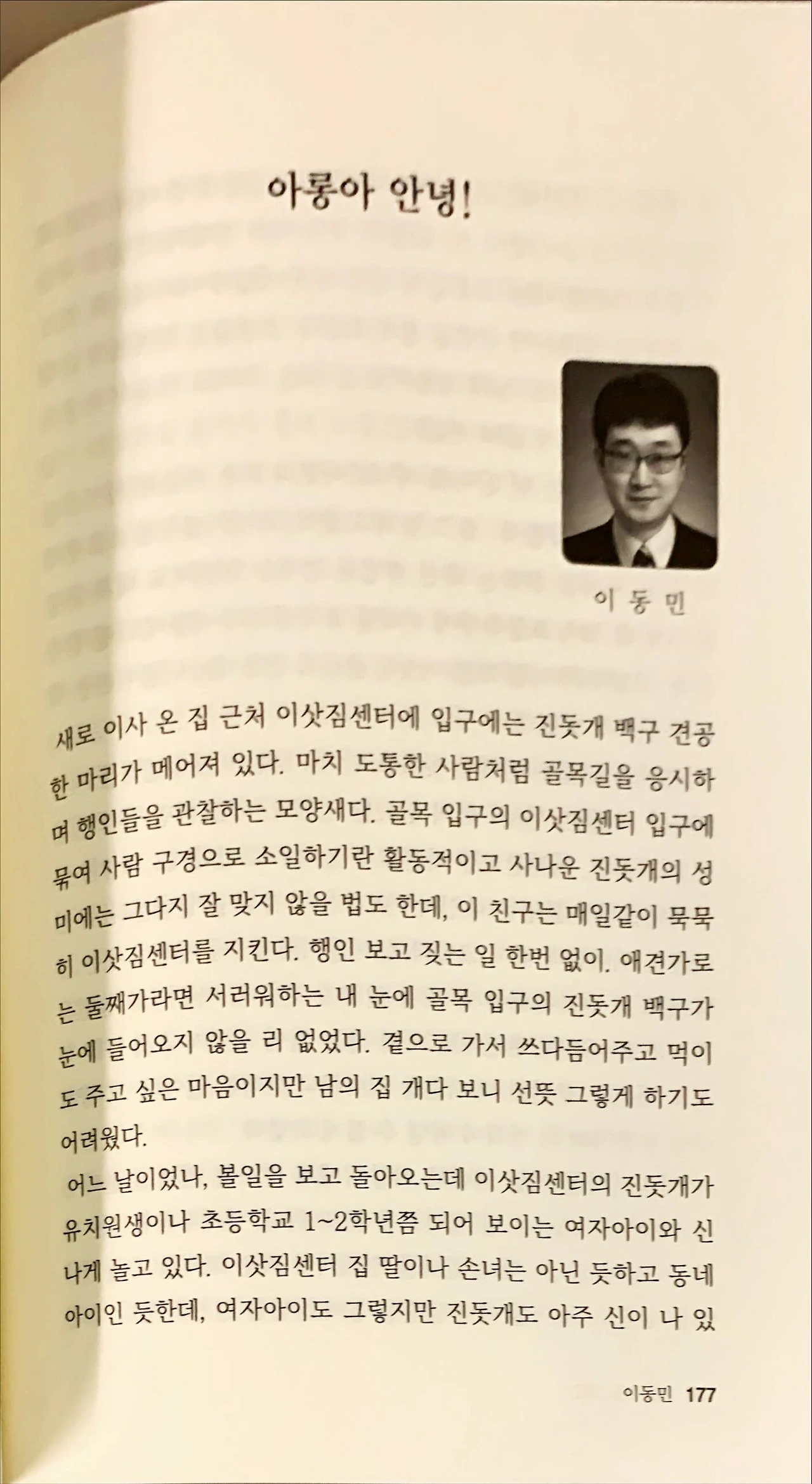 아롱이에게 인사를 건넨 뒤 쓰다듬어주고 있자니, 지나가던 할머니가 ‘개도 자기 예뻐해 주는 사람은 알아보는구나’라는 혼잣말을 하신다. 어느 하루는 차를 타고 가다 차창을 열고는 ‘아롱아 안녕’ 하며 큰 소리로 인사를 건네자, 맞은 편에서 걸어오던 아주머니가 내 쪽을 보고 웃음을 짓는다. 옆자리에 타고 있던 아내는 진돗개 아롱이에게 만날 때마다 인사를 건네는 날 알아보는 동네 사람도 꽤 있을 거라고 이야기한다. 동네 명물 아롱이에게 만날 때마다 인사하는 나도 동네 명물이 되었으려나? 십 년도 넘게 동네 골목 입구를 지켜온 아롱이, 이제 나이도 많이 들었지만 남은 시간도 행복하게 지내길 바라는 마음이다.