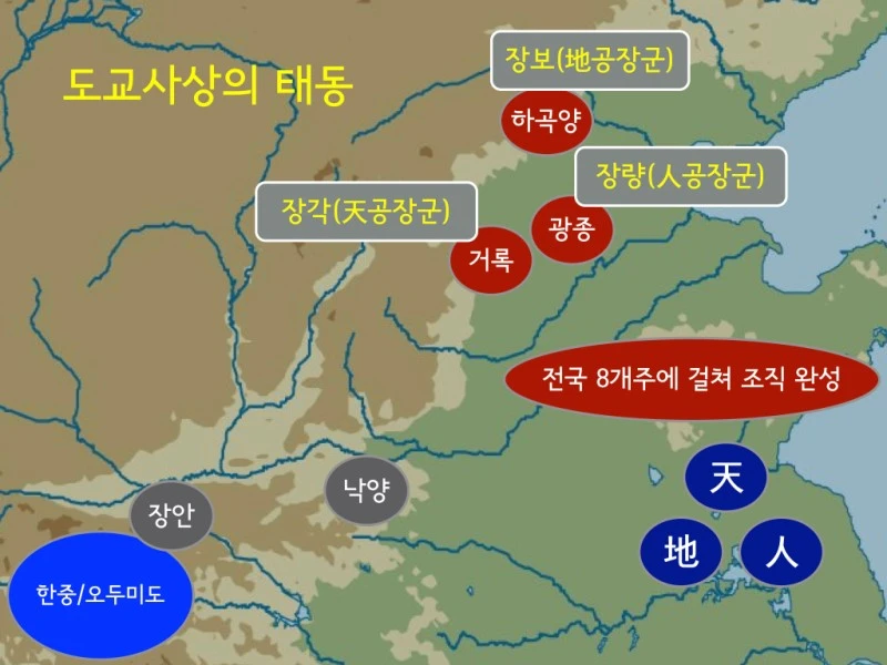 후한의 농촌 사회가 붕괴하기 시작한 2세기 중, 후반에 이르러 후한의 민중들은 새로운 세상을 갈망하기 시작했다. 이를 채워줄 수 있는 것은 종교였다. 아직 대승불교는 중국 땅에 유입된 지 얼마 안 되었고, 유교는 현실 위주의 합리적인 성격이 강했다. 그런 점에서 무위자연 사상에 토대한 도교는 중국 민중의 열망을 채워 주기에 적합한 부분이 컸다.