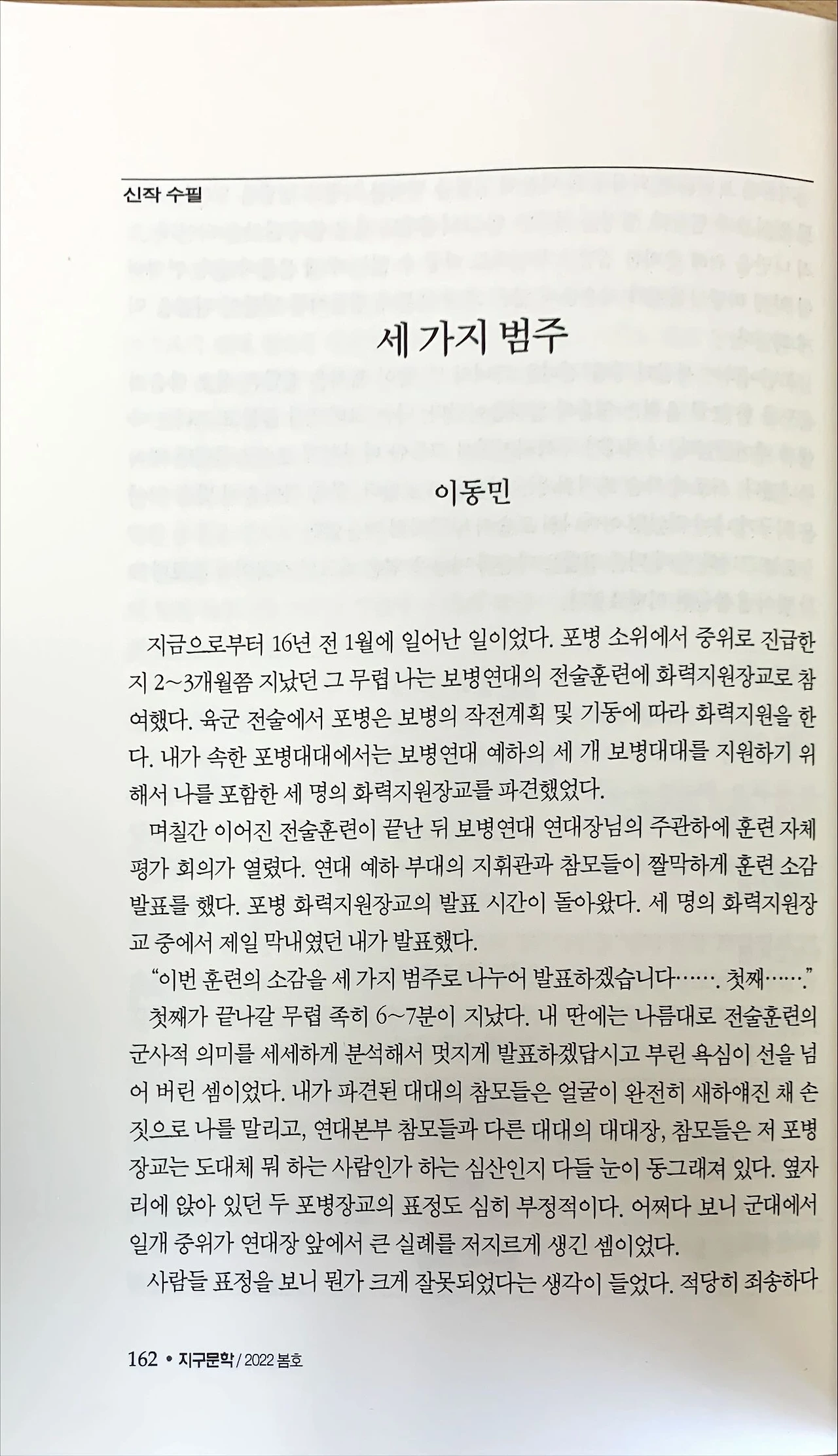 그다음부터 나는 보병연대의 대 스타가 되어 버렸다. 보병연대에 화력지원을 하러 갈 때마다 연대 참모들은 나더러 ‘이번에 맡을 화력지원 임무의 개요를 세 가지 범주로 설명해 보게’라며 농을 건넨다. 심지어 날 이름이나 직책, 계급 대신 ‘범주’라는 별명으로 부르는 지휘관이나 참모도 있을 정도였다. 그냥 작은 실수나 무례 정도였다면 망신 좀 당하고 끝냈을 일이었을지도 모르겠지만, 상상을 뛰어넘는 파격적인 대형 사고(?)를 친 덕에 ‘개념 없는’ 장교로 찍히는 대신 보병연대의 스타가 되어 버린 셈이었다. 그때 내가 화력지원을 담당하셨던 대대장님은 내가 소감 발표회에서 15분간 이야기했던 ‘세 가지 범주’를 대기업의 브랜드처럼 잘 살려 보라는 조언을 건네셨다. 장성까지 진급한 뒤 얼마 전 명예롭게 군 생활을 마감하신 그 대대장님과는 지금도 연락을 주고받으며 좋은 관계를 맺어 오고 있다.