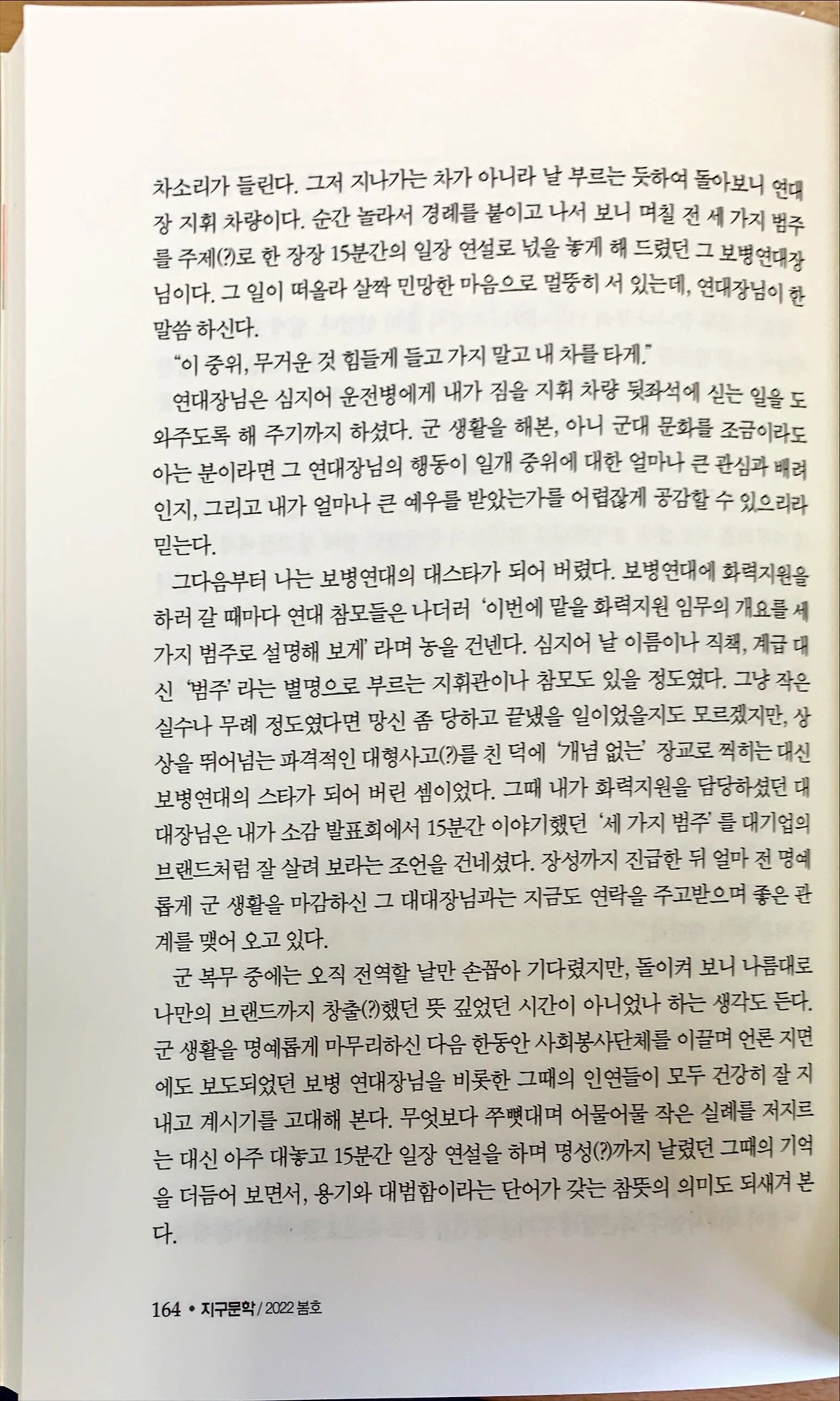 군 복무 중에는 오직 전역할 날만 손꼽아 기다렸지만, 돌이켜 보니 나름대로 나만의 브랜드까지 창출(?)했던 뜻깊었던 시간이 아니었나 하는 생각도 든다. 군 생활을 명예롭게 마무리하신 다음 한동안 사회봉사단체를 이끌며 언론 지면에도 보도되었던 보병 연대장님을 비롯한 그때의 인연들이 모두 건강히 잘 지내고 계시기를 고대해 본다. 무엇보다 쭈뼛대며 어물어물 작은 실례를 저지르는 대신 아주 대놓고 15분간 일장 연설을 하며 명성(?)까지 날렸던 그때의 기억을 더듬어 보면서, 용기와 대범함이라는 단어가 갖는 참뜻의 의미도 되새겨 본다.