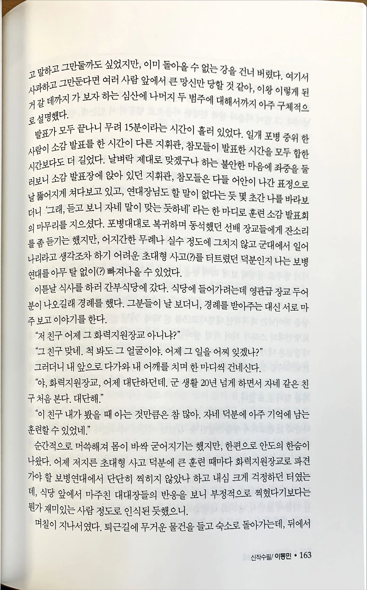 이튿날 식사를 하러 간부식당에 갔다. 식당에 들어가려는데 영관급 장교 두어 분이 나오길래 경례를 했다. 그분들이 날 보더니, 경례를 받아주는 대신 서로 마주 보고 이야기를 한다. “저 친구 어제 그 화력지원장교 아니냐?” “그 친구 맞네. 척 봐도 그 얼굴이야. 어제 그 일을 어찌 잊겠나?” 그러더니 내 앞으로 다가와 내 어깨를 치며 한 마디씩 건네신다. “야, 화력지원장교, 어제 대단하던데. 군 생활 20년 넘게 하면서 자네 같은 친구 처음 본다. 대단해.” “이 친구 내가 봤을 때 아는 것만큼은 참 많아. 자네 덕분에 아주 기억에 남는 훈련 할 수 있었네.” 순간적으로 머쓱해져 몸이 바싹 굳어지기는 했지만, 한편으로 안도의 한숨이 나왔다. 어제 저지른 초대형 사고 덕분에 큰 훈련 때마다 화력지원장교로 파견 가야 할 보병연대에서 단단히 찍히지 않았나 하고 내심 크게 걱정하던 터였는데, 식당 앞에서 마주친 대대장들의 반응을 보니 부정적으로 찍혔다기보다는 뭔가 재미있는 사람 정도로 인식된 듯했으니.