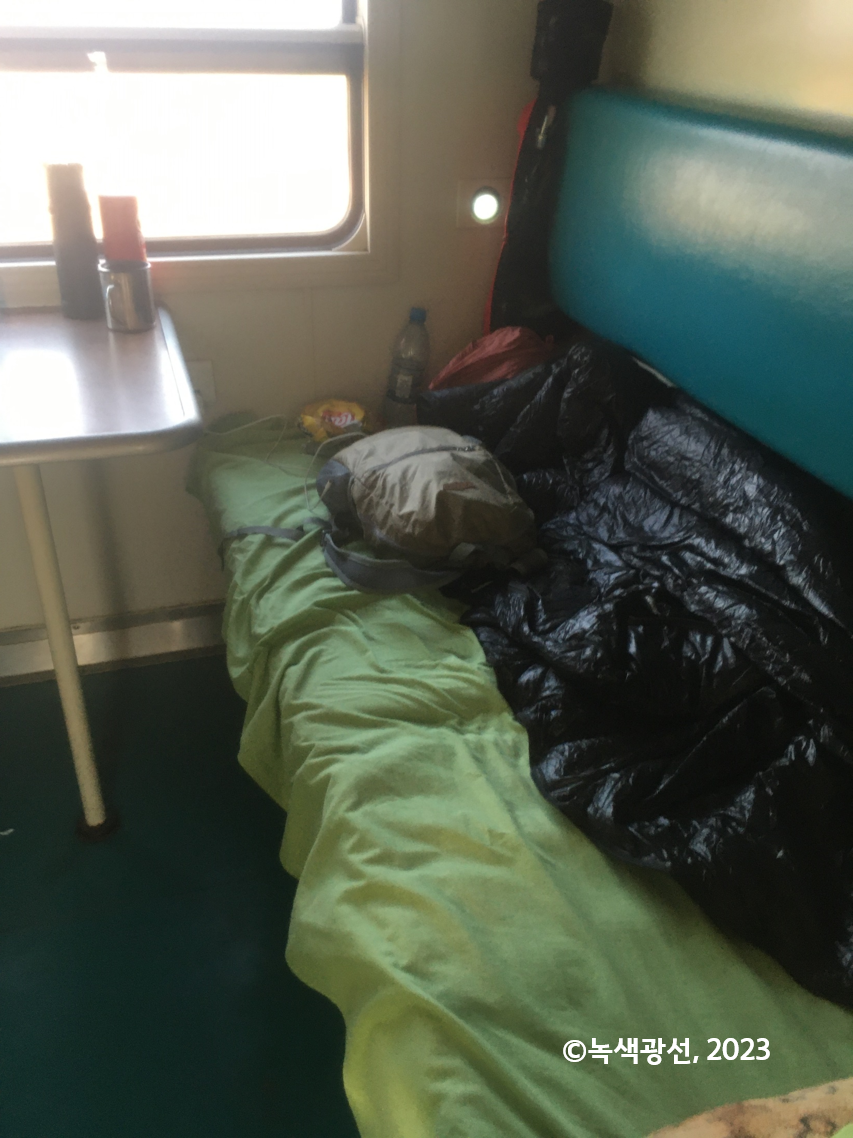 몸을 요리조리 옮겨가며 이불 삼아 내 침낭을 쫙 펼치며 며칠간 지낼만한 공간을 정리했다. 침대 구석과 벽이 맞닿는 면에는 생수병들을 줄지어 욱여넣었다. 그동안 목이 타 들어가게 건조한 아프리카 날씨 속에서도 화장실이 무서워 물 마시기를 참느라 고역이었던 참이었다. 결국 물을 와장창 샀다. 2리터 생수 6병, 작은 생수병도 여러 개. 그동안 견뎌왔던 갈증을 열차 안에서 해소해 보자!