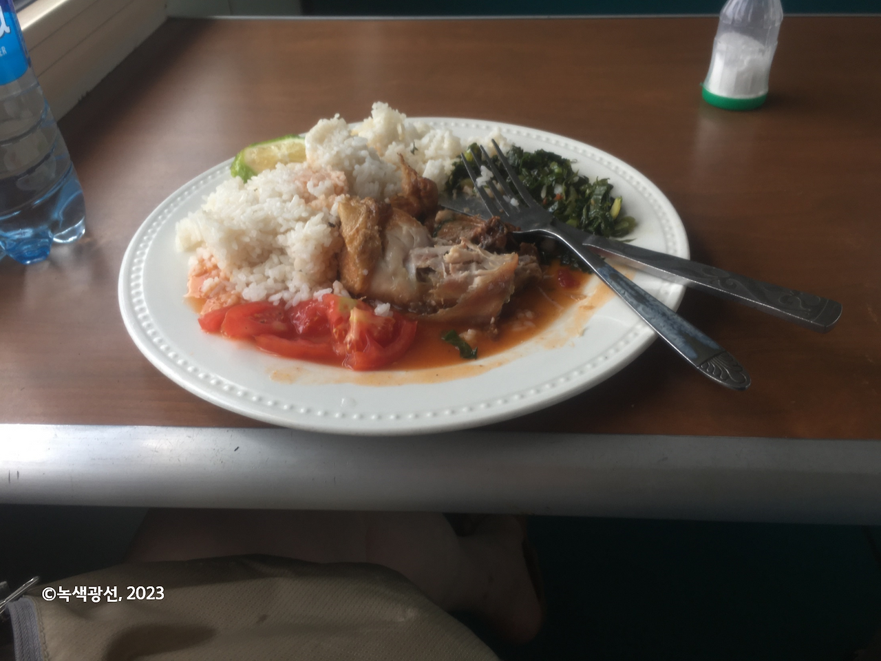 식사는 열차 맨 끝 칸에 달린 식당칸에서 해결했다. 그럭저럭 처음 먹는 메뉴이니 다 먹을 만하다. 잠비아 화폐로 한 끼 가격은 50콰차 정도다. 식사 값은 잠비아 영토에서는 잠비아 화폐인 콰차로, 국경을 넘으면 탄자니아 실링으로 지불해야 한다. 식당칸 직원이 바뀌는 것도 아닌데, 왜 이렇게 똑같은 사람에게 다른 화폐로 지불해야 하는지를 와니타에게 물어보니 또다시 쓴웃음을 짓는다. 자기도 왜 이리 번거롭게 돈을 내야 하는지 모르겠단다.