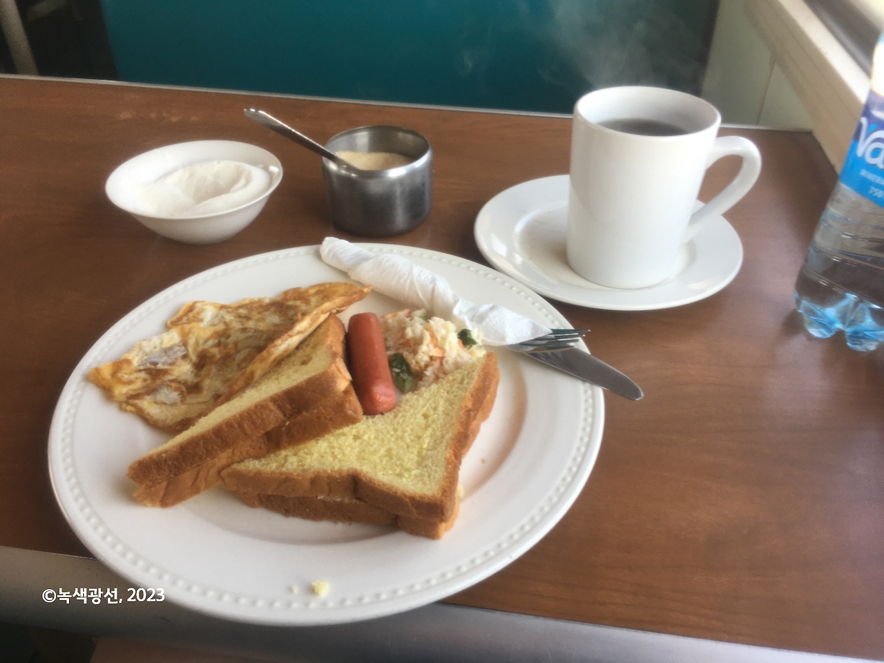 아침은 대체로 빨리 나왔지만 점심, 저녁은 요리가 나오기까지 1시간 걸렸다. 이전에 정보를 얻을 땐 1등석 칸으로는 식사를 배달해 주었다는 수기도 읽었지만 내가 여행했을 때(23년 8월)는 그렇지 않았다. 직접 식당칸으로 이동해서 현금을 내고 주문해야 밥을 먹을 수 있다.