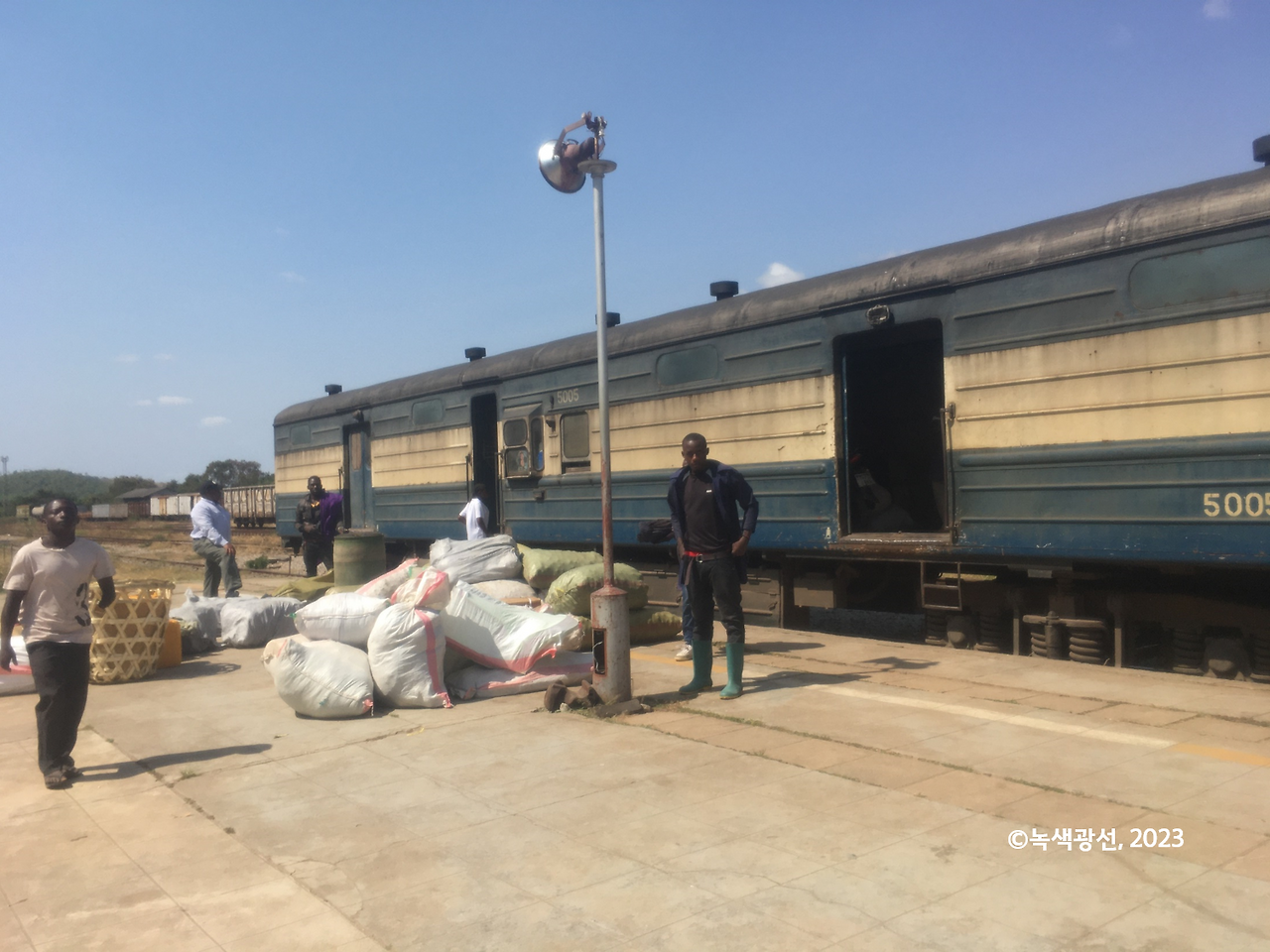 이 모든 품목들을 와니타가 현지 가이드 노릇을 해가며 다 설명해 주었다. 이곳에선 흔하디 흔한 망고 나무 아래에서 그녀가 내 개인 사진도 한 방 찍어 주고, 나도 그녀 사진을 열차 배경으로 찍고. 참고로 와니타는 아까 식당에서 밥을 먹을 때 내가 먹었던 쌀은 탄자니아 쌀이며 잠비아 쌀이 아니라고 말했다. 잠비아보다 탄자니아 쌀 품질이 최고라고 한다. 그녀는 기차 플랫폼에 장사터를 잡은 상인들 중 탄자니아 쌀을 들고 나온 여인과 가격을 흥정하며 쌀 한 자루를 사보려고 시도했지만 과연 비싸다며 그냥 포기했다.
