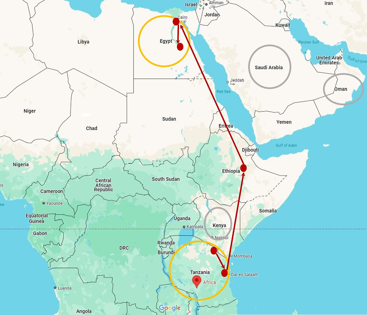 보통 탄자니아에서 사파리 투어를 한 경우 많은 이들은 케냐를 건너뛴다. 시간 여유가 많다면 에티오피아를 구경하고 다음 목적지를 이집트로 하는 경우가 많다.