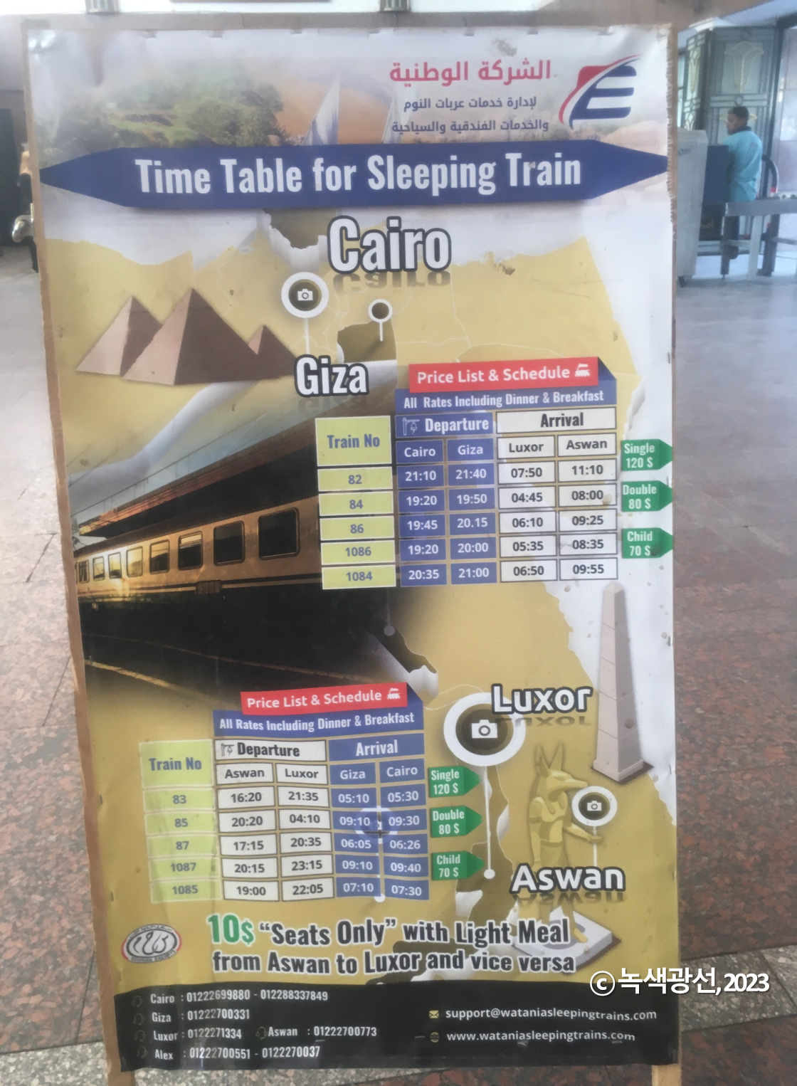 기차역에 가면 하룻밤 자면서 이 구간을 이동하는 야간 기차를 홍보하는 입간판이 있다. 소요시간은 10시간. 침대칸에 식사까지 해결되니 편할 듯 하지만 비싸다. 예약 사이트에서 요금을 조회해 보면 룩소르에서 카이로 구간이 24년 10월 현재 침대칸 가격은 1인실 130$, 2인실 90$이다.