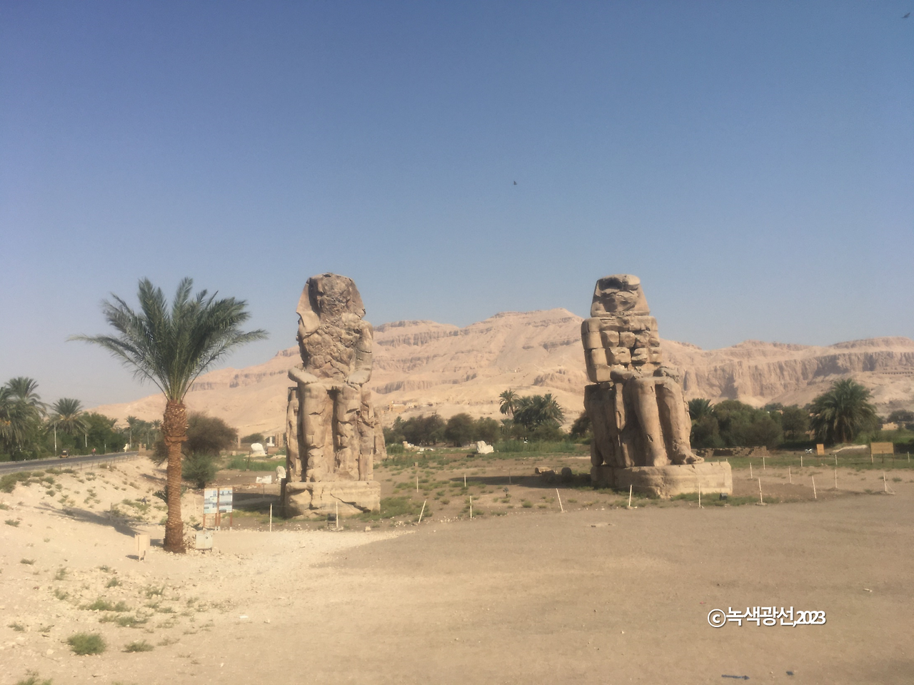 눈을 감고 다시금 떠올려본다면 이집트 풍경은 이런 색깔이다. 가장 뇌리에 박힌 기억이 무조건 태양 아래 흰 땅이라 그런 걸까? 하고 많은 유적보다도 해가 먼저 기억난다. 그야말로 눈부실 정도로 강해서 대낮에는 땅 색깔이 밝은 황토색을 넘어서서 거의 희다. 특히 직사광선이 바로 내리쬐는 곳은 눈이 부실 만큼 뽀얗다.