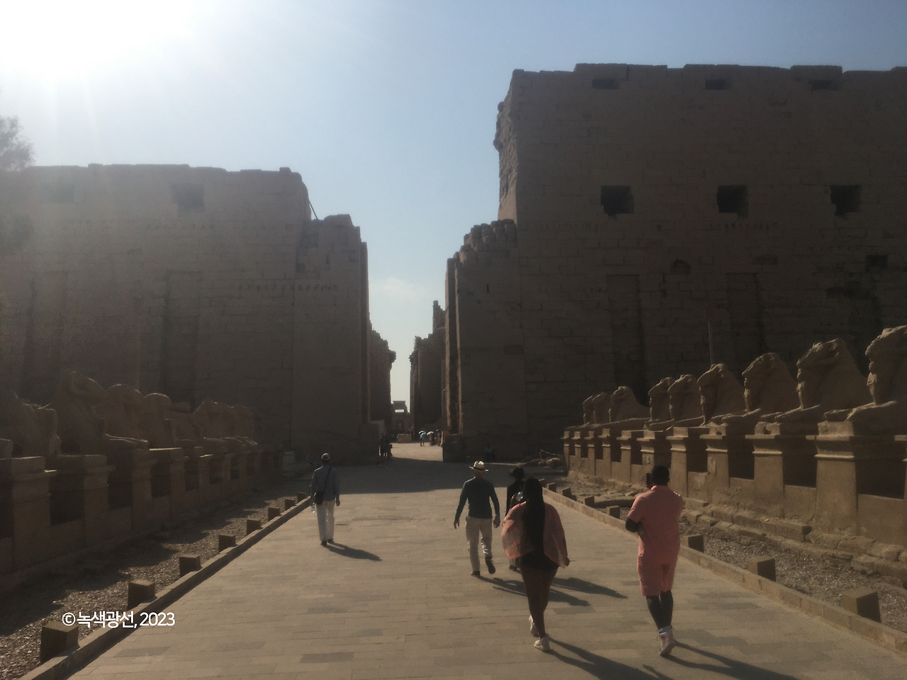 카르낙 신전은 다음날 아침 이른 새벽 공기를 마시며 한산할 때 구경했다. 여긴 룩소르 신전에 비해 규모가 크다. 다만 어느 신전에서도 안내용 표지판 같은 건 없다. 매표소 근처엔 현지인들이 유적을 해설해 주는 척, 관광객들에게 달라붙어 가이드를 해주겠다고 유혹한다. 한 둘이 아니다. 이들은 입장문 근처를 빈둥거리며 끈질기게 관광객에게 달라붙는다. 일당을 한몫 챙기려는 것이다. 외국인은 비싼 입장료를 내고 신전에 입장하건만 현지 꼬맹이들, 개나 고양이들이 몰래몰래 담을 넘어 너무나 쉽게 신전을 들락날락 거리는 모습도 쉽게 볼 수 있다. 감시 카메라도 있지만, 무용지물인 걸까.
