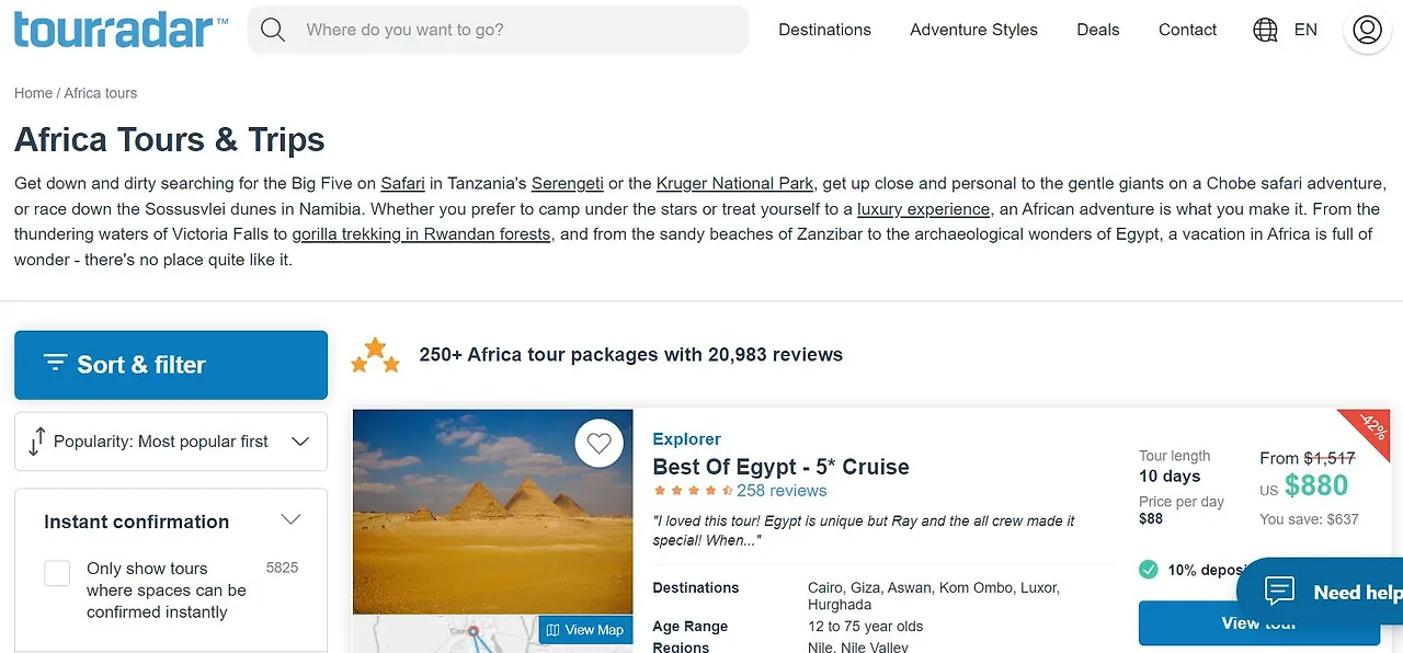 전 세계 현지 투어 상품을 대륙별, 나라별로 검색하기 좋게 모아둔 이런 사이트에서 검색해 보는 방법도 있다. 영어가 편하다면 구글 검색창에서 'africa tour'라고 검색어를 입력하면 다양한 투어 상품을 소개하는 수많은 사이트들을 확인할 수 있다.