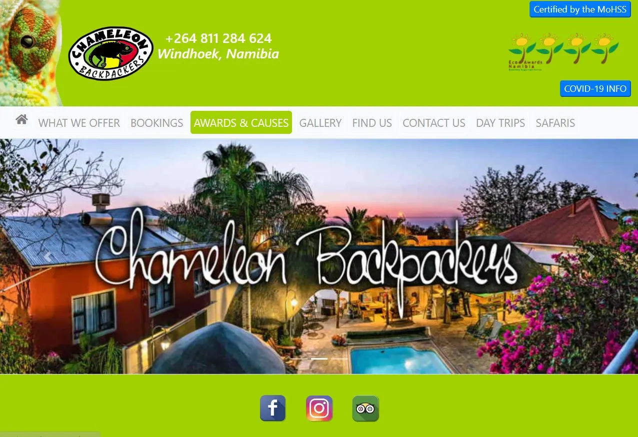 나미비아(Namibia)를 여행할 계획이 있다면 수도 빈트후크(Windhoek)에 위치한 카멜레온 백패커스에서 주관하는 여행 상품을 예약하는 것도 좋다. 이곳은 유명한 호스텔이고 자체적으로 운영하는 여행 상품도 있다. 홈페이지 상에 여행 상품도 안내되어 있으니 살펴볼 수 있다. 다만 상품 별로 출발할 수 있는 날짜는 생각보다 한정되어 있으니 미리 검색해 보자.