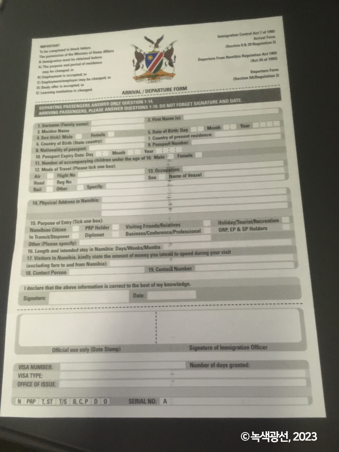 비행기로 남아공에서 나미비아로 이동하면 착륙 전 승무원이 이 서류(사진 1. 나미비아 입/출국 신고서)를 승객들에게 나누어 준다. 착륙 전까지 기내에서 작성할 시간은 충분하니 미리 필기구와 숙소 주소를 준비해 두었다가 기내에서 이 서류에 적으면 된다. 크게 아래와 같은 항목이다.