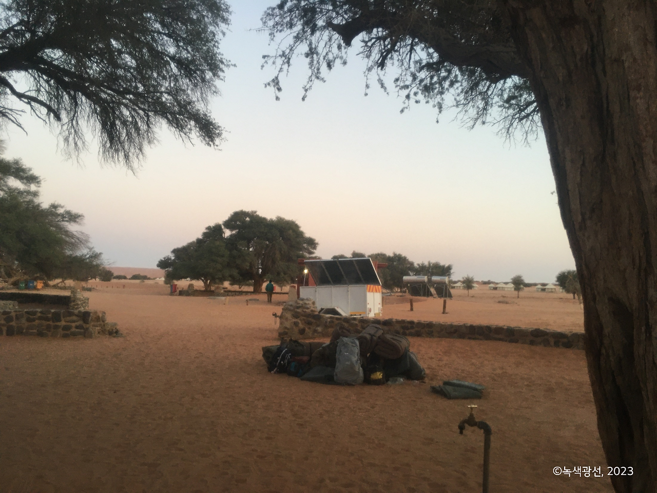 이곳 세스림 캠핑장은 사막 위 오아시스 같은 곳이다. 가이드에게 '세스림'이 무슨 뜻인지 물어보니 친절하게 알려주었다. '세(se)'라는 소리는 아프리카어로 '숫자 6'을 뜻한다고 한다. 대강 설명을 듣기로는 옛날에 사람들이 물을 찾기 위해 동물 가죽으로 만든 밧줄을 6번 묶고, 이렇게 6개 끈을 물통에 연결해서 땅 속 깊이 그 밧줄을 내려서 결국 물을 찾았다는 전설이 전해진다고 한다. 대대로 물이 귀한 지역이니 이렇게 물을 찾기 위한 전설이 전해지나 싶었다.