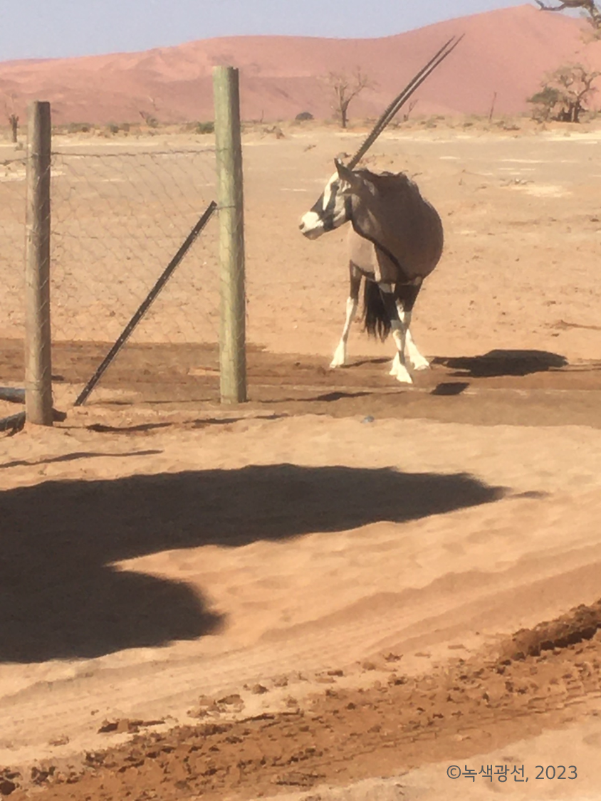 쟈칼과 하이에나를 피해야 하니 문을 꼭 닫으라는 문구가 공용 화장실 겸 샤워장 문 앞에 붙어 있다. 나미비아를 대표하는 동물, '오릭스(Oryx)'도 대낮에 캠핑장을 걸어 다닌다. 마치 한국에서 비둘기가 사람을 무서워하지 않듯 아주 자연스러운 풍경이다.