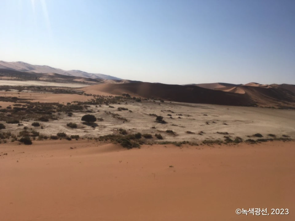 기온도 다시 오로기 시작했다. 나미비아 사막에서는 하루 안에 봄, 여름, 가을, 겨울 날씨를 다 경험할 수 있다. 밤부터 이른 아침까지는 패딩을 껴입어야 하는 겨울 날씨다. 아침을 먹고 나서는 점점 봄 날씨로 바뀐다. 한낮엔 찌는 듯한 여름 무더위를, 늦은 오후부터는 겨울이 오기 전 선선해지는 가을 날씨를 느낄 수 있다. 변덕스러운 날씨 덕분에 안에는 민소매 티를, 겉에는 두꺼운 겨울옷을 입은 사람들을 심심치 않게 본다.
