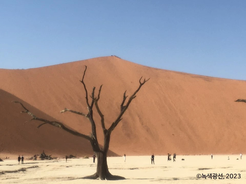 곧이어 데드 블레이(Deadvlei)로 향했다. 이젠 물이 없어 생명이 살 수 없는 곳. 사진 속 나무들은, 아니, 나무 미이라라고 불러야겠다. 이 흔적들은 먼 옛날 이곳에서 뿌리를 내리고 식물이 살았다는 걸 보여준다. 하지만 이젠 저런 검은빛 나무 미이라만 남았다. 수분이 사라진 나무 기둥을 손으로 만져보면 마치 돌처럼 단단하다. 목이 타들어가는 듯한 사막 기온을 느끼며 살갗이 아프도록 뜨거운 태양이 새삼 무서워진다.