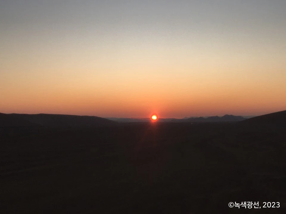 이렇게 큰 태양을 처음 보았다. 우리나라에서 보았던 일출과는 달랐다. 이글이글 끓는 태양이 내 눈앞에 가까이 다가오며 커졌다. 붉은 해와 나 사이 거리는 점점 가까워졌다. 사진에 나온 저 조그만 해가 점점 부풀어 오르며 커다란 원 모양의 불 덩어리로 변해가는 걸 지켜보면서도 믿을 수 없을 만큼 경이로웠다.