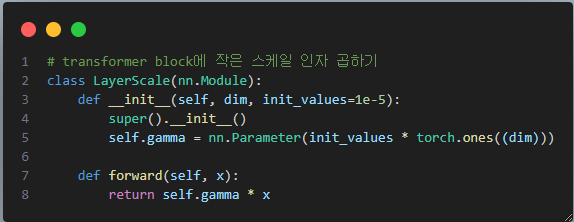 mlp 레이어는 그다지 특별한 것이 없습니다. ViT와 동일합니다. Drop Path는 timm 라이브러리 구현체를 사용하며, Layer Scale은 이전에 사용했던 구현체를 그대로 사용합니다. 코드는 아래와 같습니다.