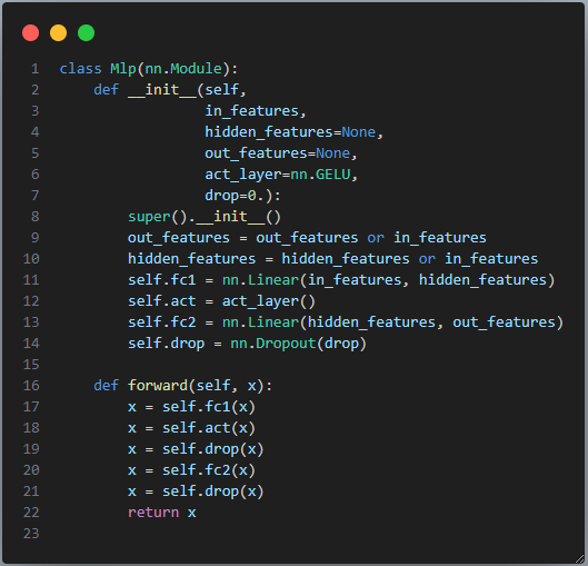 Swin Transformer Block은 크게 W-MSA, SW-MSA와 함께 Layer Normalization, 그리고 MLP, 세부적으로는 dropout과 residual connection, 추가적으로 이전 ViT에서 소개한 Drop Path와 Layer Scale을 적용할 것입니다. MLP 코드는 아래와 같습니다.