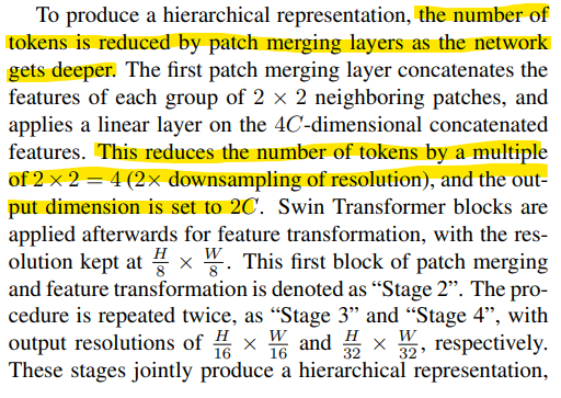 본 논문에서 제시된 사항에 따르면 네트워크가 깊어질수록 Patch Merging을 통해 4개의 인근 패치(2x2 neighboring patches)를 하나로 합치면서 채널 수를 두 배로 늘려나갑니다. 이를 통해 계층적 표현(hierarchical representation)이 가능해게 됩니다. 구체적으로 채널 수가 두 배로 늘어나지만 해상도가 4배로 줄어들기 때문에 계산효율성이 늘어나고, 점차 수용영역(Receptive Field)이 넓어짐으로써 다양한 해상도에서의 특징을 파악하는 것이 가능해집니다.