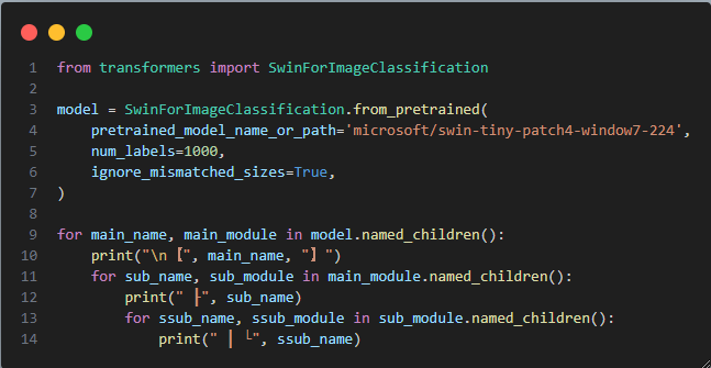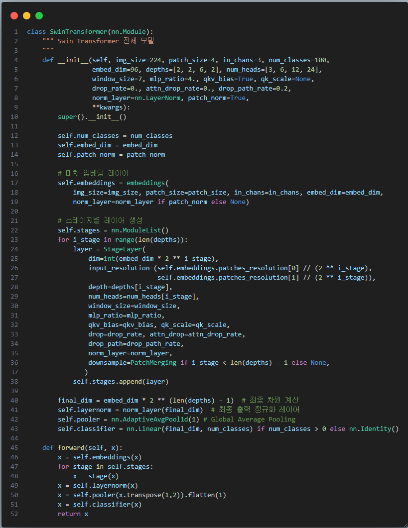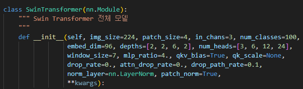 Swin Transformer의 개념 자체는 복잡하지 않은 모델이지만, 여러 레이어들이 교차적으로 들어가거나 순차적으로 들어가야하고 익숙치 않은 개념이 적용되기 때문에 구현을 위해선 명확히 짚고 넘어가야 합니다. 우선 각각의 레이어를 구축하기 전에 사전 구현된 모델을 통해 전체 구조를 살펴보고 넘어가보겠습니다. 이 부분에 대한 전체 코드는 제 github를 참조하시면 됩니다.
