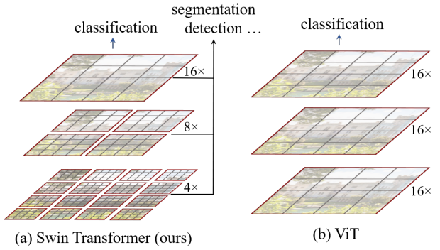 Swin Transformer의 핵심은 계층적인 구조라는 것입니다. 한 장의 이미지를 일정한 사이즈의 패치로 나눠, 패치 간의 어텐션을 계산하던 것이 이전에 리뷰한 ViT였습니다. 이는 이미지를 고정된 사이즈의 패치로 나눠야 하기 때문에, 이미지 사이즈가 달라지면 그에 따라 입력층, Patch Embedding, Positional Embedding과 같은 층이 통째로 교체되어야 하고, 이 과정에서 사전학습된 가중치까지 같이 사라지며 큰 데이터셋에 사전학습하며 성숙시킨 성능을 함께 잃어야 했습니다.