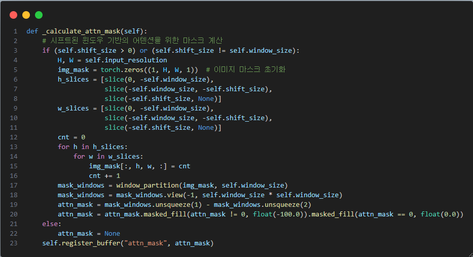 첫 번째는 init입니다. [row30~35] 다양한 이미지의 사이즈가 입력될 수 있기 때문에 이를 고려해, 윈도우 사이즈보다 작은 이미지가 입력될 경우 등을 대비한 코드를 추가해줍니다. [row37~53] 그 외에는 순서대로 layer normalization, attention layer, drop path, mlp 등을 정의합니다. [row56] 마지막으로 cyclic shift가 진행될 경우를 대비해 어텐션 마스크를 계산하는 함수를 호출합니다. 다음으로 Attention Mask를 작성하는 코드를 살펴보면 아래와 같습니다.