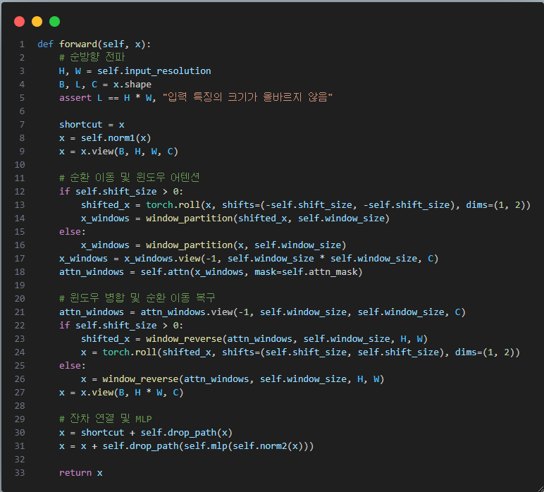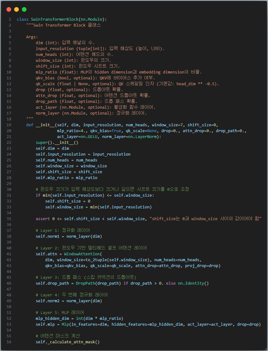 여태까지 구현한 클래스들을 이용해 Transformer Block을 구현해보겠습니다. 이 코드에서는 cyclic shift와 이를 고려한 SW-MSA, 마스크 생성 등이 추가됩니다. 전체 코드가 길기 때문에 크게 세 개로 나눠서 살펴보도록 보겠습니다.