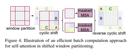 본 논문을 구현하면서 가장 헷갈렸던 부분이기도 했는데요, 위 프로세스를 구성하는 핵심은 cyclic shift입니다. 아래 그림의 제일 왼쪽을 보면 cyclic shift에서 원본 이미지는 총 9개의 조각으로 나뉘게 됩니다. 하지만 작은 좌상단의 윈도우들을 우하단으로 이동시킴으로써 9개의 조각은 4개의 윈도우만으로 처리할 수 있어 연산효율성을 얻을 수 있습니다.
