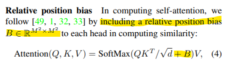 상대적 위치편향은 위 수식과 같이 어텐션 스코어를 계산하는 과정에서 추가적인 정보를 제공하는 역할을 하게 됩니다. 또한 이를 통해 위치정보를 전달했기 때문에 이전의 트랜스포머 구조와 달리 위치 인코딩이나 위치 임베딩을 사용하지 않습니다. 또한 이미지 사이즈가 커지거나, 패치 사이즈가 줄어 패치 수가 늘어나면 이전에 진행했던 방법으로 상대적 위치정보를 전달하는 위치행렬 내부의 값 일부가 커져 제대로 연산되지 않는 문제가 생길 수 있습니다.