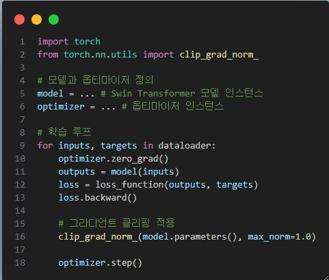 본 논문에서는 threshold로 적용할 max_norm을 1로 두었습니다. 이를 코드로 적용하려면 아래와 같이 학습 코드를 작성해야 합니다. 이때 주의할 점은 optimizer.step() 이전에 적용해야 한다는 것입니다.