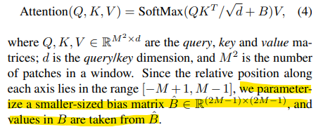 본 논문에서는 상대적 위치편향을 구현하는 과정에서 다음과 같이 M^2 사이즈의 상대적 위치 편향 B를 (2M-1)x(2M-1) 사이즈의 B hat으로부터 추출한다고 되어 있습니다. 참고로 2M-1이라는 단위는 상대적 위치편향의 범위(-M+1, M-1)을 고려한 최대 범위입니다.